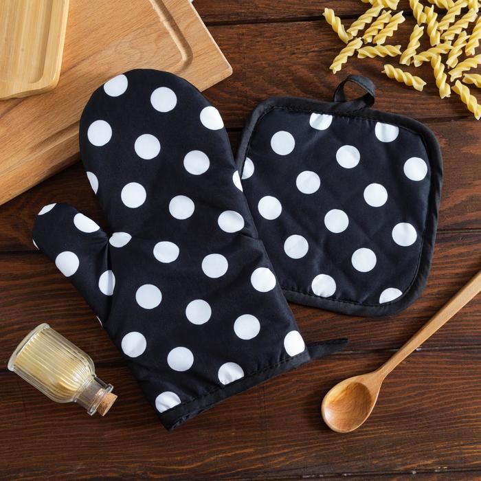 Кухонный набор (2 предмета) Доляна «Горох», цвет черный, прихватка 17×17 см, рукавичка 26×16 см, 100% п/э